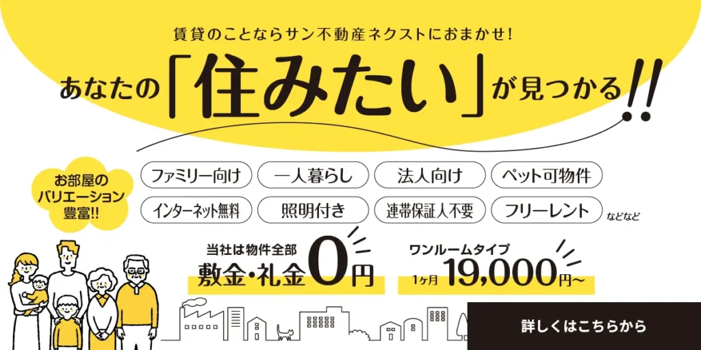 笑顔あふれる、 人々の暮らし。 群馬県伊勢崎市を中心に、前橋市・高崎市・太田市など、賃貸物件のことならお任せ下さい REAL ESTATE 物件のことなら実績豊富な当社にお任せください! サン不動産ネクストは物件管理の会社です。ファミリー・単身・学生向けなどの種類豊富な物件を取扱い、お客様のニーズにお応えしています。 お客様の「暮らしやすい」を追求するために様々な分野のスペシャリストとタッグを組み、ご満足いただけるよう日々の業務に努めています。 テナント物件もご紹介いたします。物件探しの際はぜひ当社へご相談ください。 上武大学・東京福祉大学「新入学生キャンペーン」実施中!賃貸アパートが安く契約できます! 上武大学・東京福祉大学「新入学生キャンペーン」実施中!賃貸アパートが安く契約できます! NEWS お知らせ 2025-10-09 求人採用特設サイトを開設! 2025-09-30 10月臨時休業のご案内 2025-08-29 9月臨時休業のご案内 2025-07-26 お盆休業日のご案内 2025-07-11 事務スタッフ募集 2025-07-01 7月臨時休業のご案内 MORE WORK 施工例 リノベーションで建物に、 新たな価値を生み出します。 アパート・マンションの老朽化や空室問題は、リフォーム・リノベーションで解決できます。リノベーション・リフォームを幅広く展開いる弊社の一番得意とする部門です。空室を抱えるアパート・マンションを始め、さまざまなニーズにお応えししつつ、入居者からの目線を第一に考え、幅広いライフスタイルに馴染むお部屋に仕上げています。 MORE RENTAL 賃貸物件 あなたと暮らしを繋ぎたい。 住居や事業所の物件はお任せ! ファミリー・単身・学生向けなど、種類豊富な物件を取扱い、お客様のニーズにお応えしています。お客様の「暮らしやすい」を追求するために様々な分野のスペシャリストとタッグを組み、お客様にご満足頂けるサービスを提供しています。物件探しの際はぜひ当社へご相談ください。 賃貸住宅物件 クリックすると、弊社の物件情報一覧が表示されます。 貸店舗・事務所・売物件 掲載中の物件が各カテゴリーごとに表示されています。 MORE BLOG ブログ 2025-10-18 伊勢崎市本町店舗兼住居の外壁塗装完了 伊勢崎市本町にある店舗兼住居の物件の外壁塗装工事が完了しま... 2025-09-23 伊勢崎市本町の店舗兼住居、完成間近 当社のそばにある、店舗兼住居の物件の進捗状況です。近くの物件... 2025-09-18 太田市金山町マンションの改修工事完了 ちょっと前ですが、太田市金山町のマンションの改修工事完了し... 2025-09-02 江木町マンションの外壁塗装完了 高崎市江木町のマンション、塗装工事が完了しました!とはいえ、... MORE CONTACT お問い合わせ ご依頼及び業務内容へのご質問などお気軽にお問い合わせください。 ※ご来社の場合はお電話でお問合せください。 0120-309-803 お問い合わせフォーム 各種書類 採用情報 プライバシーポリシー 株式会社サン不動産ネクスト 免許番号:群馬県知事(02)第007508号営業時間:9:00〜18:00 定休日:水曜日 〒372-0047 群馬県伊勢崎市本町10-18 TEL : 0270-61-8552 0120-309-803 FAX : 0270-61-8573 ©2025 株式会社サン不動産ネクスト All rights reserved.