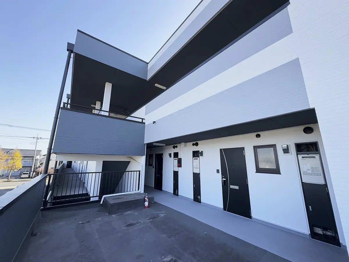 伊勢崎市除ケ町にあるアパートの外壁塗装工事が完了しました。 1Fには学習塾、アパート部分には東京福祉大学や上武大学の学生さんが住んでいる物件です。塗装前はピンクとブルーグレーの配色で、若い方が入居されることを意識してなのかポップな感じの建物でした。 リニューアル後はシックで大人な、モノトーン調の建物へと生まれ変わりました。入居者の評判も好評のようです。