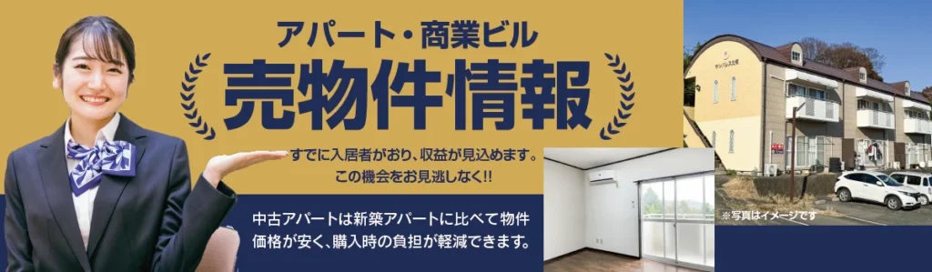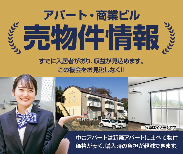 売り物件 前橋の繁華街にある、好立地の収益物件。 物件名 サンシャイン前橋 住 所 前橋市千代田町5-13-26 MAP 交 通 上毛電鉄「中央前橋駅」徒歩2分 価 格 4,980万円 延床面積 4,778.80m²(1,447.82坪) 土地面積 666.27m²(201.9坪) 築年月 1981年8月 構造/規模 鉄骨造8階建 都市計画 市街化区域 用途地域 商業地域 上毛電鉄中央前橋駅から徒歩2分。前橋中央銀座通り沿いにある建物の周辺は飲食店が多くあり、いつも多くの人で賑わっています。 物件詳細情報 長く利用されてる方の多い、いつも満室の優良物件。 物件名 サンパレス北橘 住 所 群馬県渋川市北橘町八崎1136-2 MAP 交 通 JR上越線「渋川駅」徒歩31分 価 格 2,800万円 延床面積 259.20m²(78.4坪) 土地面積 672.00m²(203.28坪) 築年月 1994年11月 構造/規模 軽量鉄骨2階建 間取り 2DK×6室 専有面積 43.21m²(1室) 空室期間が少なく、長く利用されている方が多い、優良アパートです。建物前に建造物がなく、日当たりも良好で、利用者から好評な物件です。 物件詳細情報